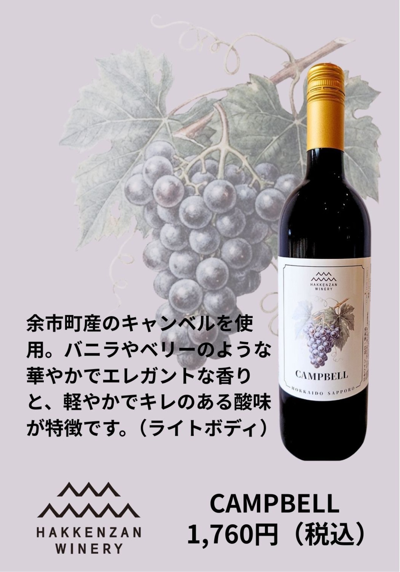 コメント:余市町産のキャンベルを使用した、魅力的な赤ワインです。豊かなフルーツ感としっかりとした酸味が特徴で、バニラやベリーの華やかな香りが食欲をそそります。ナッツやカカオのニュアンスも感じられ、ライトボディならではの飲みやすさが魅力です。気軽なテーブルワインとしてお楽しみいただけます!