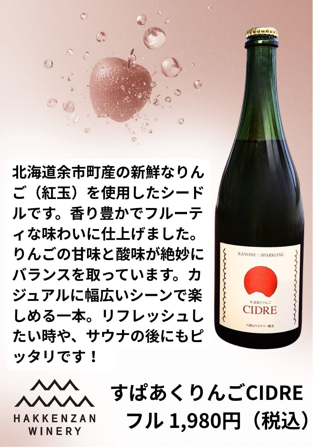 コメント:北海道余市町産の新鮮なりんごを使用したスパークリングシードルです。自然な発酵を大切にし、香り豊かでフルーティな味わいに仕上げました。りんごの甘味と酸味が絶妙にバランスを取っています。ピクニックやホームパーティーなど、カジュアルに幅広いシーンで楽しめる一本です。爽やかな飲み口で、リフレッシュしたい時や、サウナの後にもピッタリです!