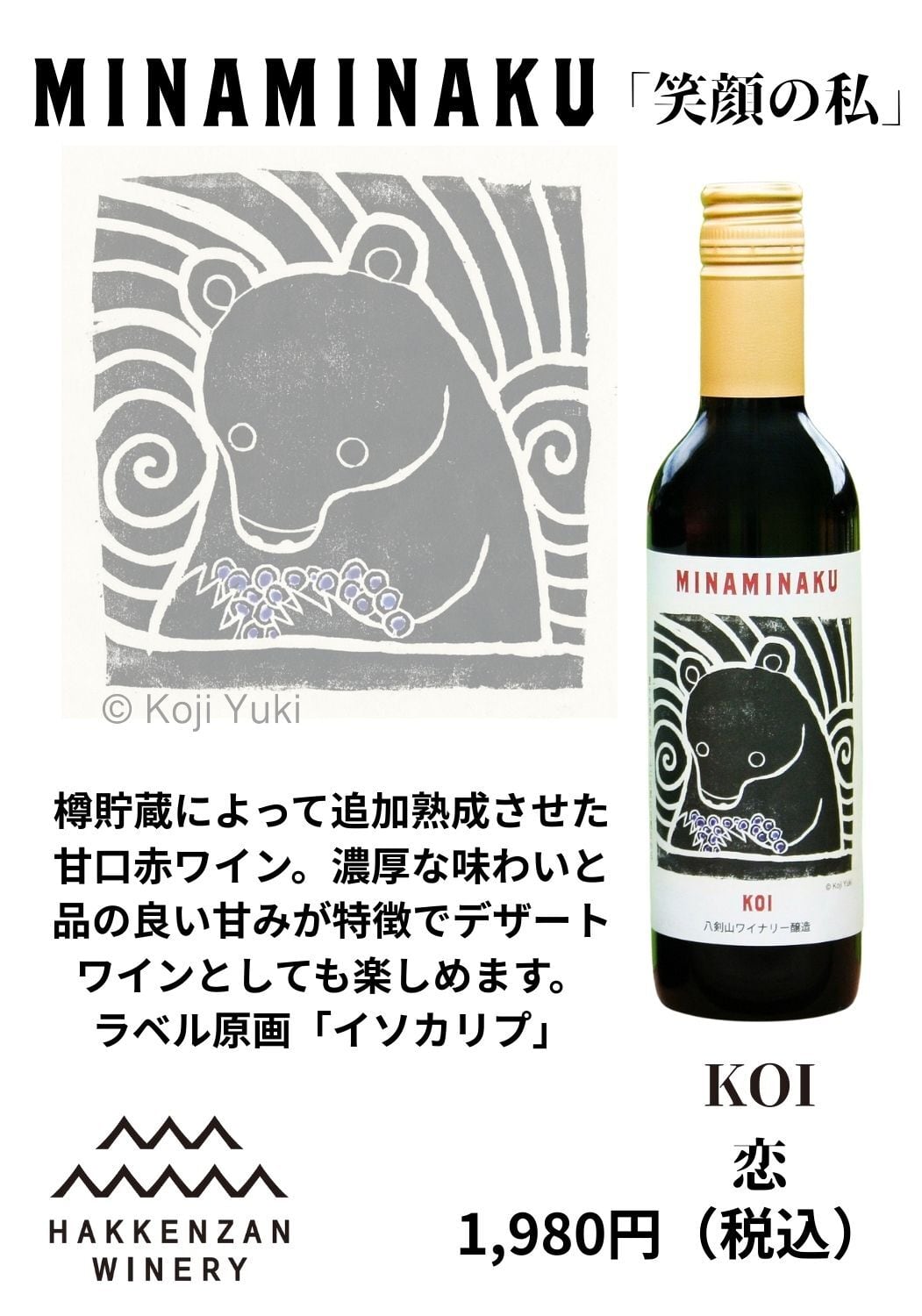 ラベルデザインはアイヌ系アーティストの結城幸司さんがデザインした八剣山ワイナリーオリジナルラベルを使用しております。ブランド名MINAMINAKUもアイヌ語から名付けたものです。ラベルは心を明るく照らすアート作品です。