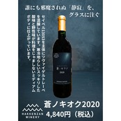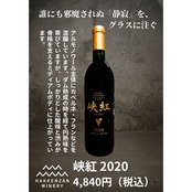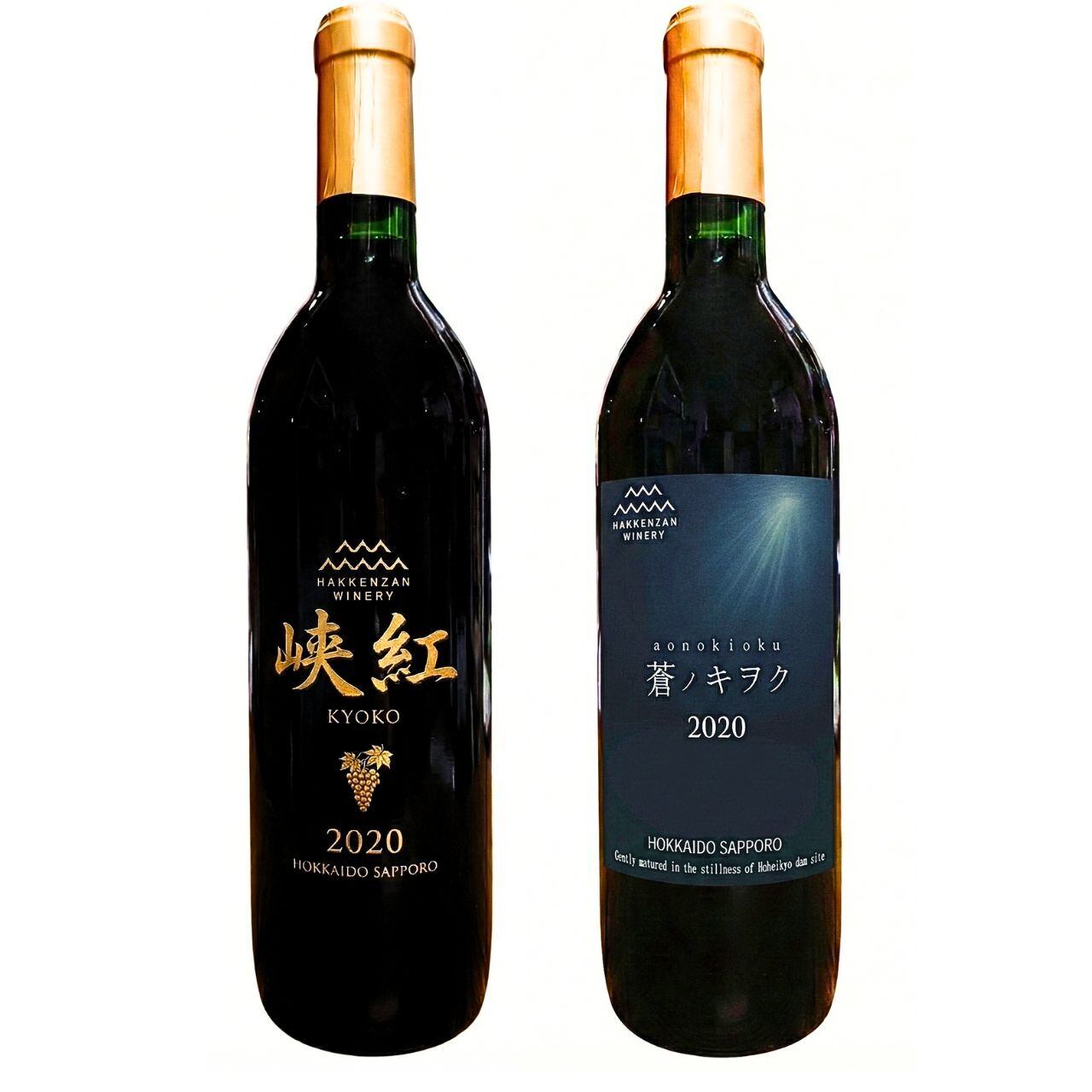 自社圃場産ボルドー系ぶどう100%使用の峡紅2020年と、自社圃場のツヴァイゲルトレーベに自社圃場産セイベルと契約農家のセイベルをブレンドした蒼ノキオク2020年